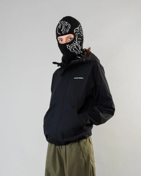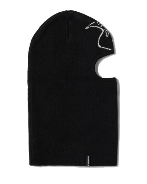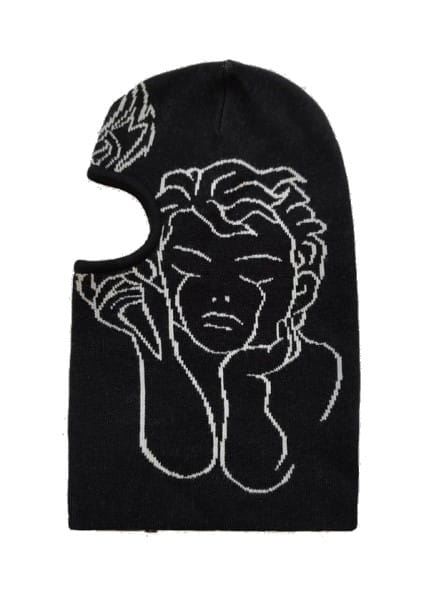 Jacquard knit balaclava with angel artwork and woven logo patch.