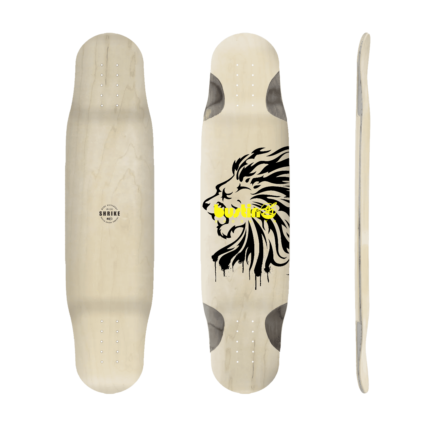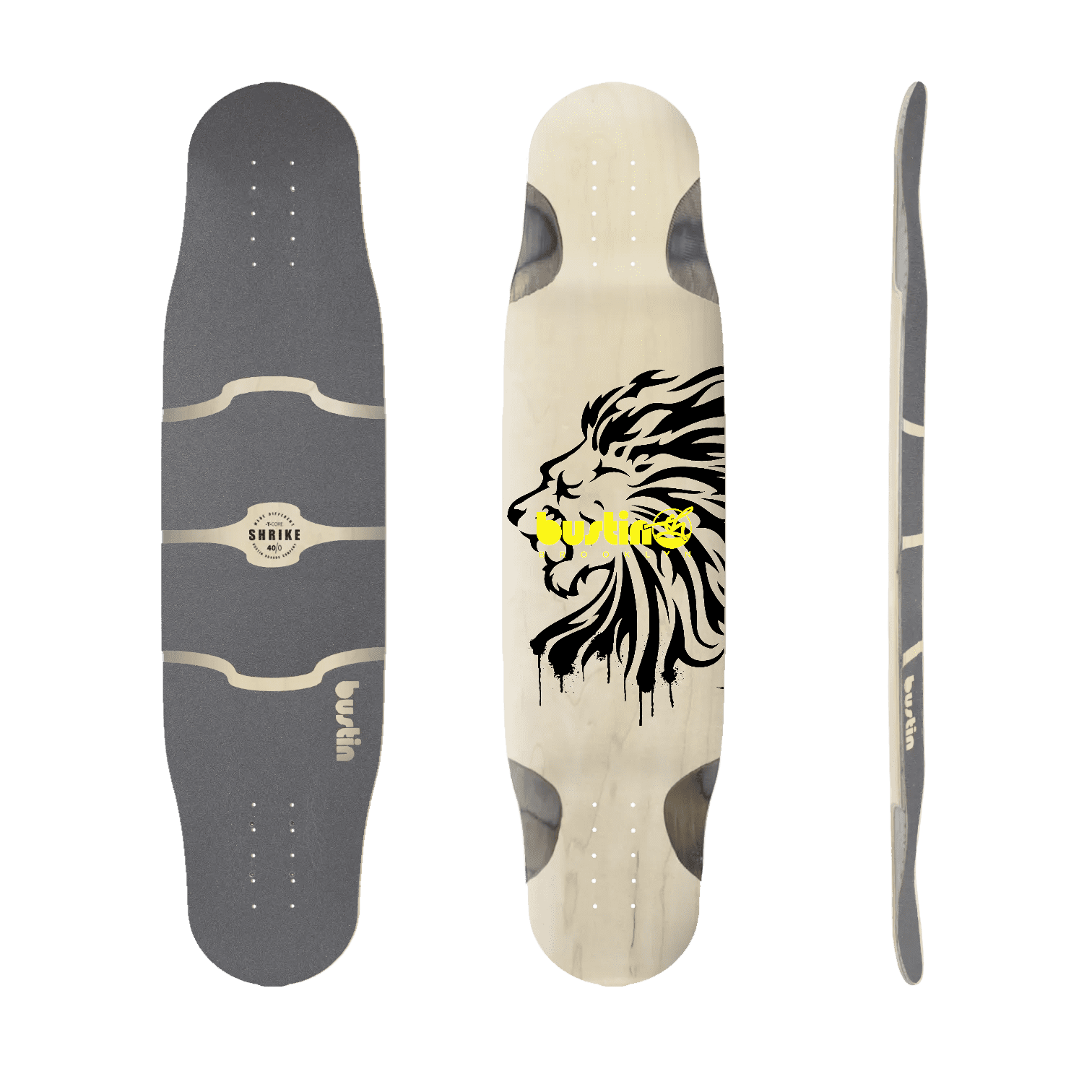 Das Shrike begann als Double-Kick-Downhill-Board, wurde aber von Pushern, Dancern und Freestylern gleichermaßen angenommen. Bei der neuesten Version hat Bustin die Tails mit einer Schräge versehen, um die Freestyle-Welt noch freier zu machen.