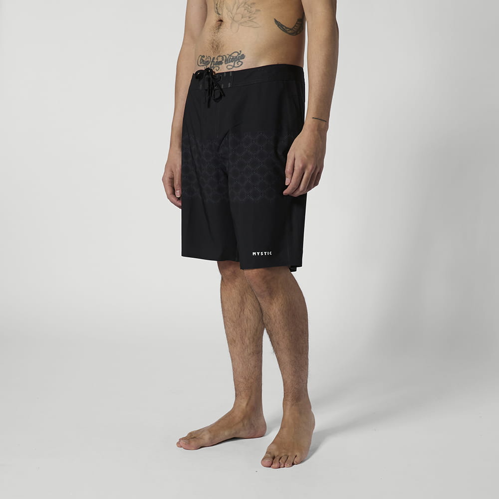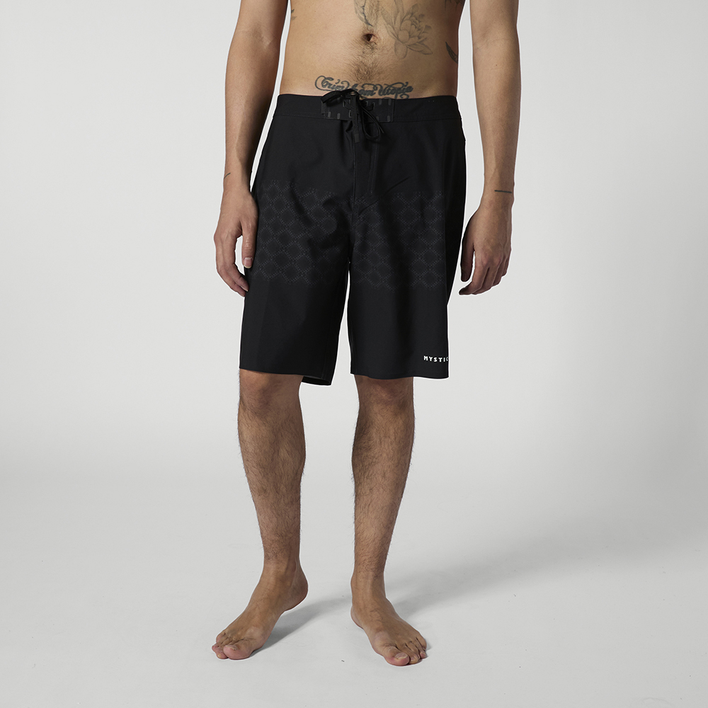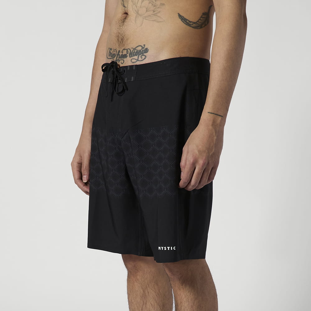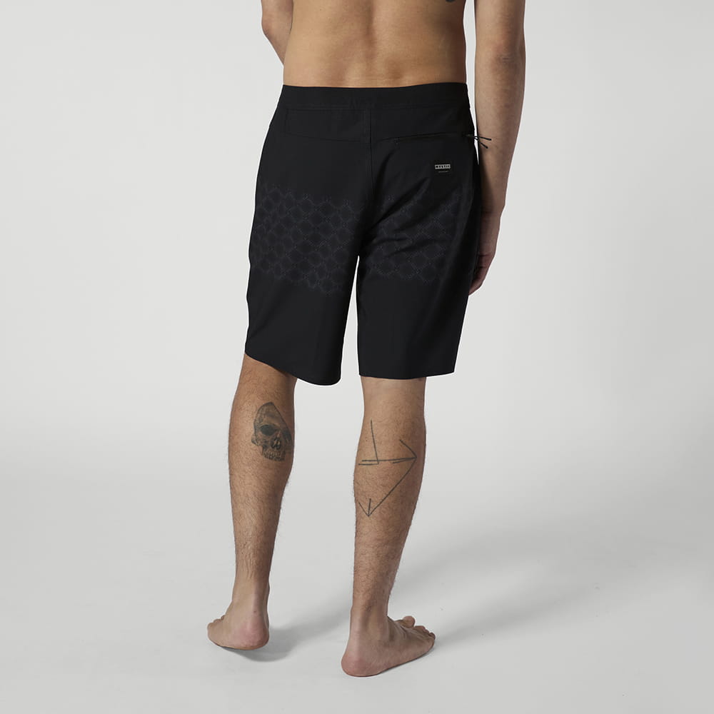 Prism Boardshort Das Prism Boardshort pairs 4-way stretch mit durable stitched seams für a lightweight feel in the water. A subtle prism print gives it a clean, modern finish. An easy pair to keep in your lineup für summer sessions. Material: 92% Polyester / 8% Elasthan, 4 way stretch, 140gsm Features: - Outseam 20"""" - M-fly - Zip pocket mit key cord at right back leg