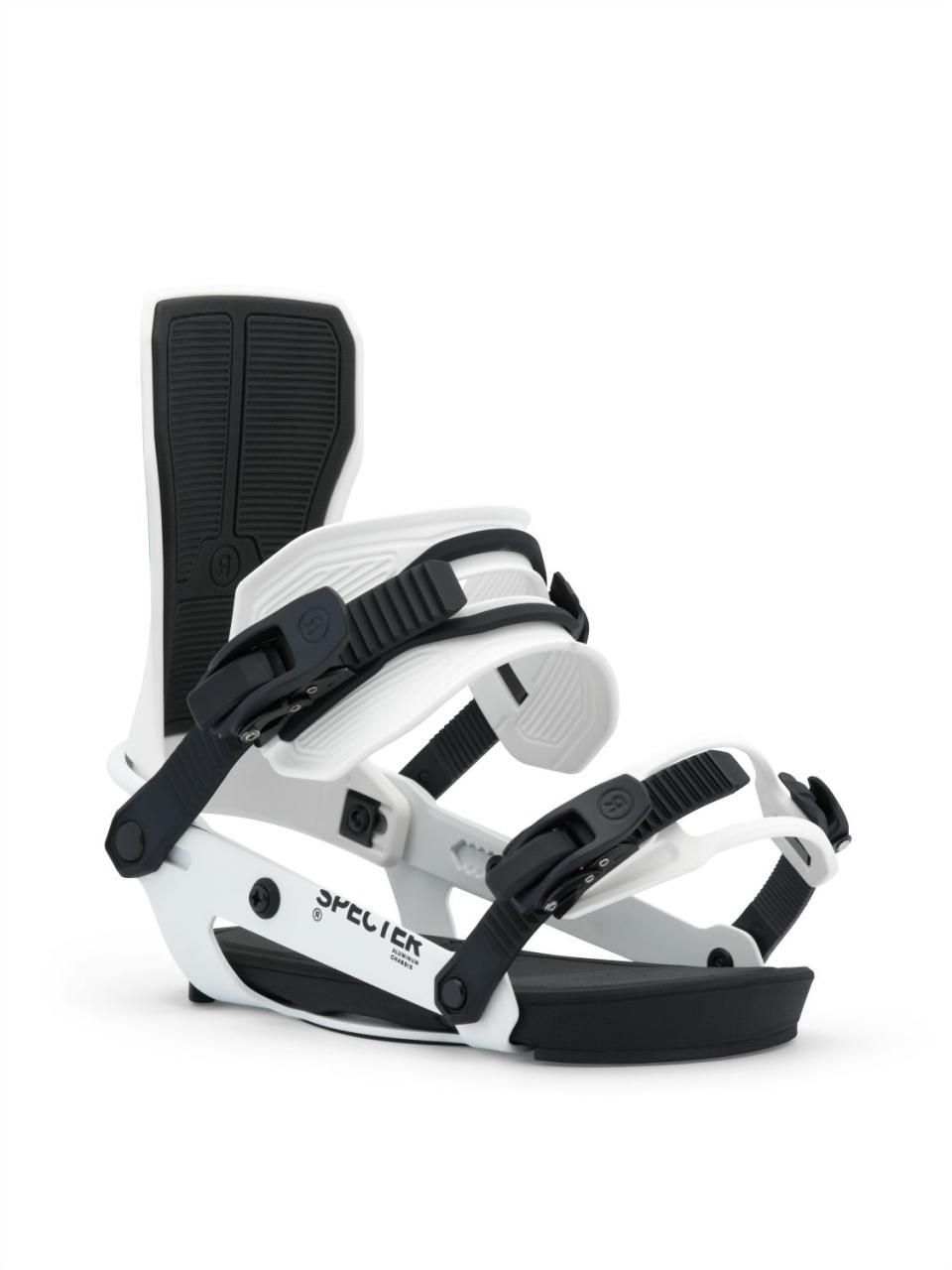 Die Specter basiert auf dem A-Series-Chassis. Dieses Aluminium-Chassis bietet geringes Gewicht und Langlebigkeit. Die einzigartigen Eigenschaften von Aluminium ermöglichen es der Bindung, sich mit deinem Board zu bewegen und so das ultimative Freestyle-Feeling zu bieten. Damit sie perfekt für Freestyle-Fahrten geeignet ist, wurden der Vorwärtsneigungswinkel und den Flex optimiert, und mit dem neuen flachen Nylon-Highback wurde der Vorwärtsneigungsblock eliminiert. Mal ehrlich, du hättest das Ding sowieso abgenommen, um Gewicht zu sparen. Der brandneue Knöchelriemen besteht aus Urethan, wodurch ein Rahmen mit mittlerer Flexibilität entsteht, der mit einem weicheren Material gepolstert ist, um eine bessere Druckverteilung beim Festziehen zu gewährleisten. Damit ist dieser Riemen einer der bequemsten in der Produktreihe. Der minimalistische Zehenriemen passt über die Oberseite oder die Vorderseite deines Boots, ohne zusätzliches Gewicht zu verursachen.